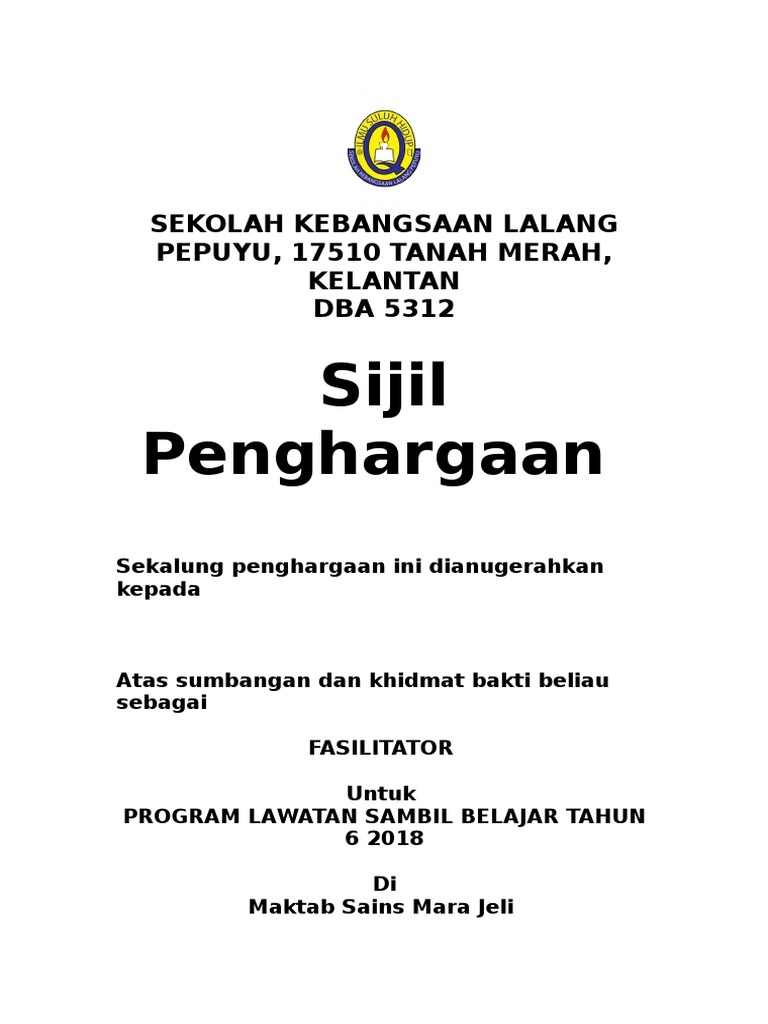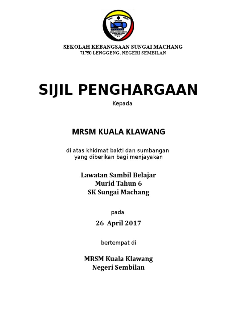 Cuti sekolah cari a. Sk Tawakal Satap Contoh Sijil Penghargaan Sempena Lawatan.
